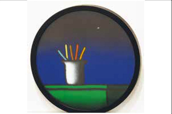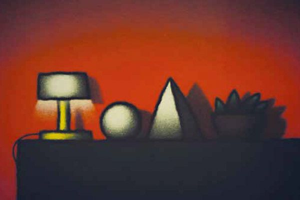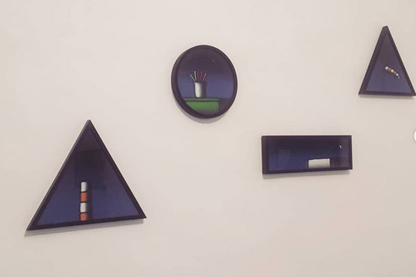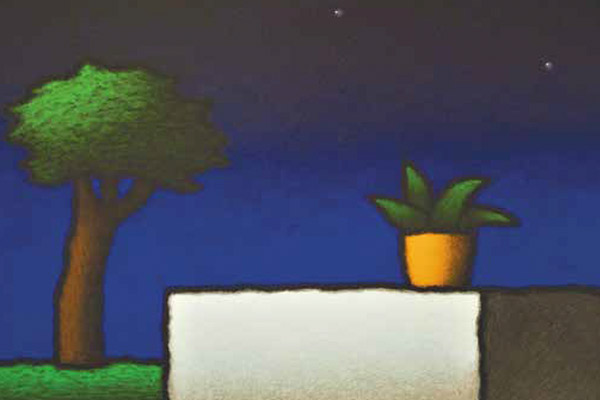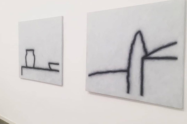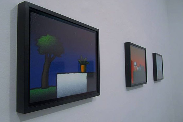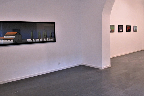 Un tratto all’apparenza infantile, ma in realtà studiato e minuzioso, delinea su tele di piccole dimensioni e dai formati insoliti – per esempio triangolare o rotondo – dettagli di edifici, vasi da fiori, bandierine svolazzanti: il colore monocromo dello sfondo, irrorato di una luminosità di cui è arduo cogliere la provenienza, fa stagliare questi oggetti “qualsiasi” e li rende assoluti.